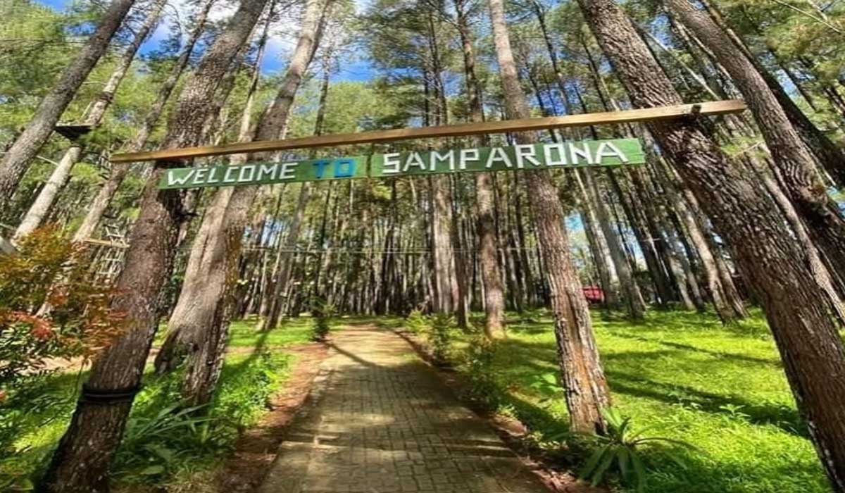 Spot foto 10 juta views TikTok. Jembatan kayu love shape panjang 15 meter antar pohon pinus. Ayunan raksasa kapasitas 4 orang view lembah 200 meter. Spot matahari terbenam puncak pinus emas jingga. Homestay Samparona View 10 kamar Rp 300.000/malam fasilitas AC, WiFi 20 Mbps, dapur bersama, balkon private. Area camping 2 ha tenda sewa Rp 50.000/orang lengkap api unggun, musik akustik malam.